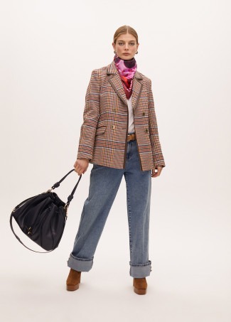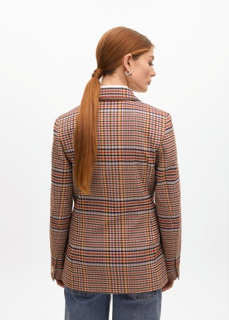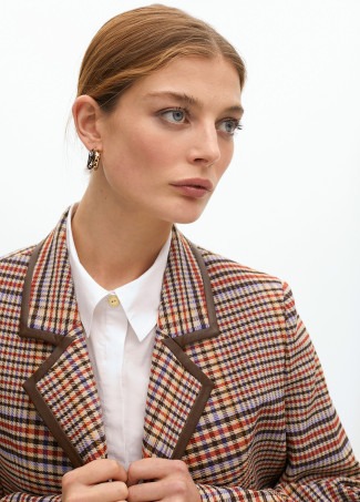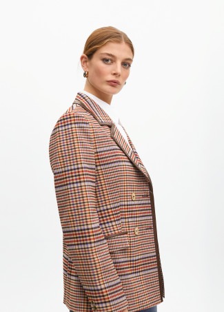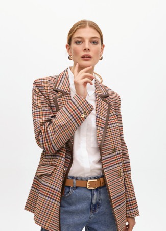 Elegante americana cruzada con diseño de cuadros y ribete de contraste. Confeccionada en tejido suave y resistente. Botonadura doble y bolsillos frontales integrados. Ideal para un look sofisticado en cualquier ocasión.