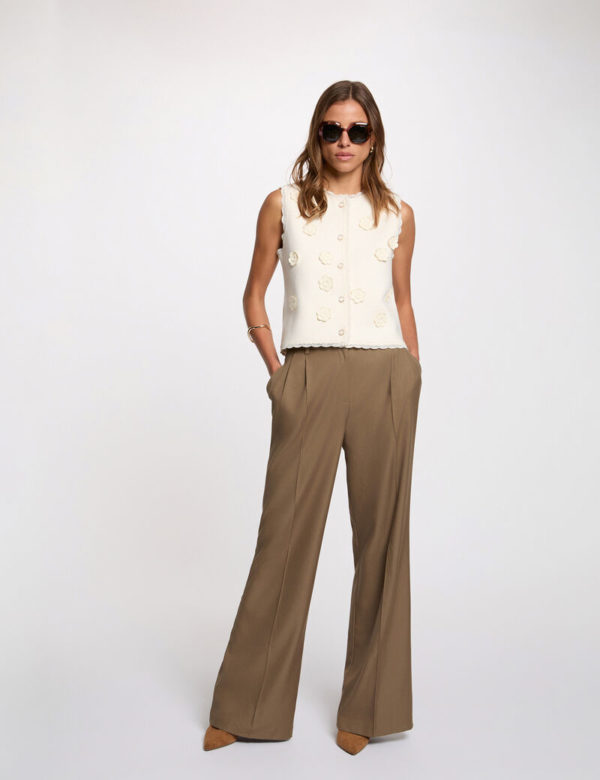 - El cárdigan ajustado con botones se combina con un pantalón fluido para un estilo femenino y moderno.