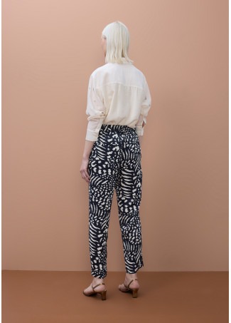 Pantalón jogger de satén con exclusivo estampado abstracto. Ajuste cómodo gracias a su cinturilla elástica con cordón. Acabado elegante y suave, ideal para ocasiones casual o formales. Bolsillos laterales prácticos.