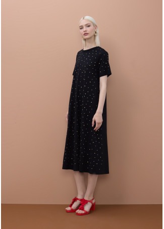 Vestido corto y fluido con mangas cortas adornado con tachas doradas. Confeccionado en un tejido ligero que se adapta cómodamente al cuerpo. Un diseño versátil y moderno ideal para marcar tendencia este verano.